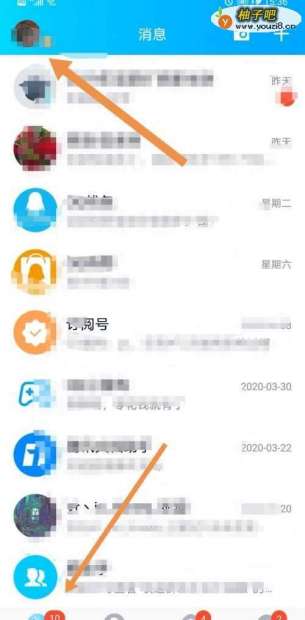 打开手机,登录QQ,先点击左下角消息,再点击左上角我的头像。