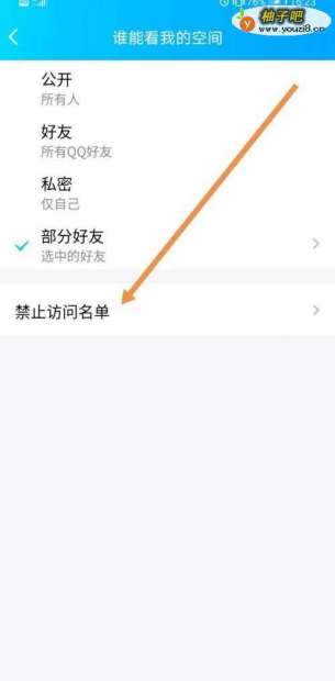 6点击打开谁能看我的空间,找到禁止访问名单并点击选择。