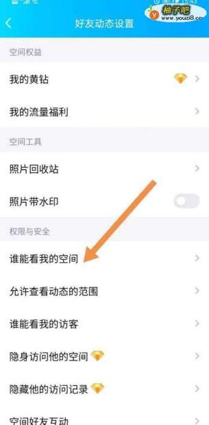 5点击打开好友动态权限设置,找到谁能看我的空间。