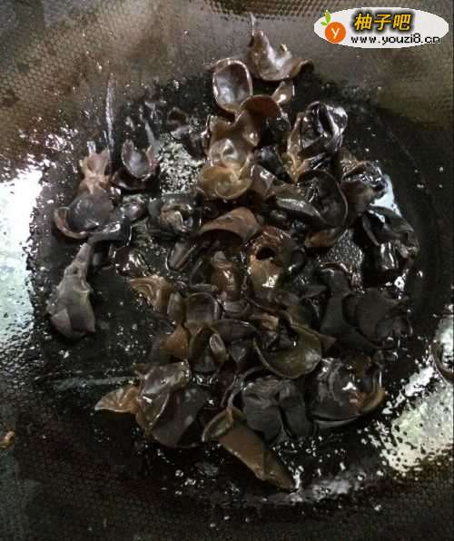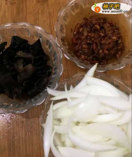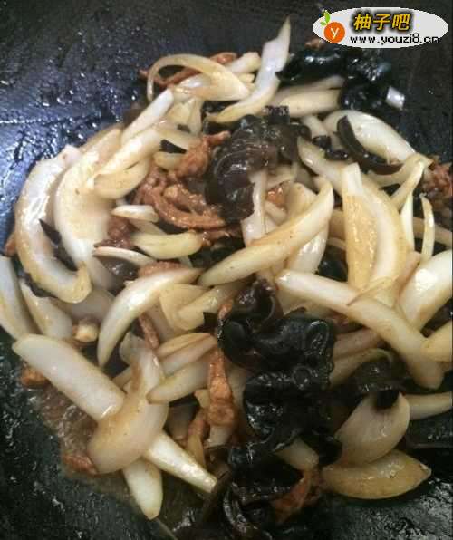 6锅里的余油烧热,放木耳炒一会,再放洋葱翻炒。