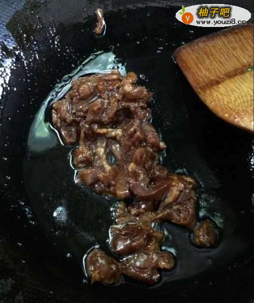 5锅里放油,小火冷油放入肉丝翻炒,变色后起锅备用。