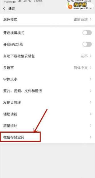4在“通用”界面,点击【微信存储空间】选项;