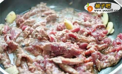 2以2大匙油热锅后,蒜片下锅爆香,再将牛肉下锅拌炒,约7-8分熟时起锅备用。