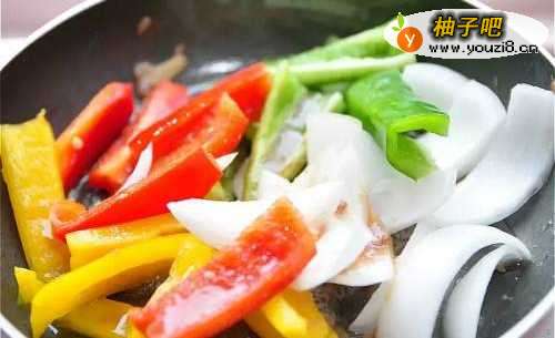 3另外将彩椒及洋葱全下锅拌炒。