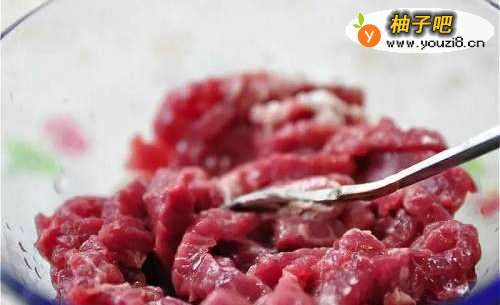 将牛肉丝以腌料均匀拌一下,腌渍30~40分钟。
