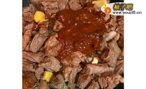 44、将番茄、白萝卜、炒好的牛肉一起倒入炖煮的洋葱锅里,以小火慢煮30-40分钟。