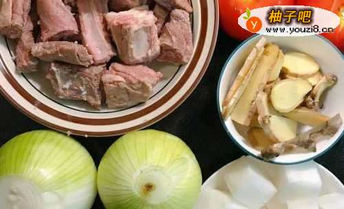 1、先将牛肋条氽烫去腥味,再将洋葱和水放在大锅子中小火炖煮,放在旁边备用。