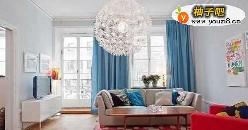 2客厅的色彩来自软装搭配,天蓝色的窗帘、灰色的沙发、红色的座椅,橘色的装饰画,给家注入青春活力。