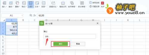 2选中区域,单击【智能工具箱】——【计算】——【除以】——【100】——【确定】;