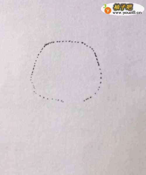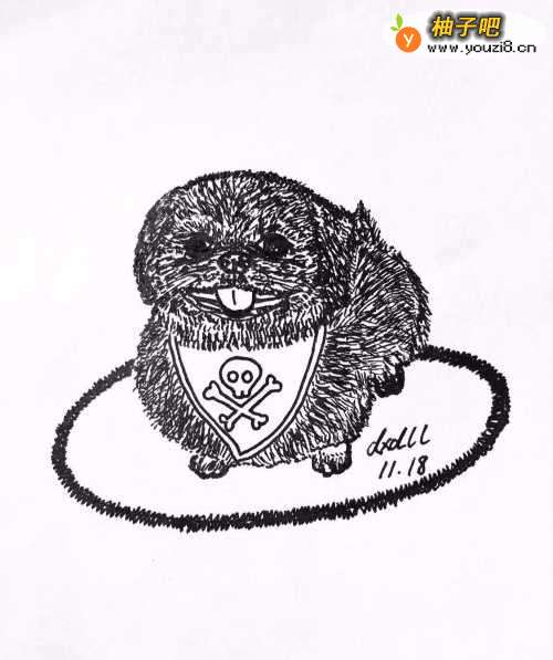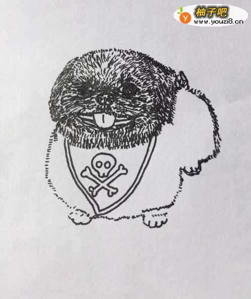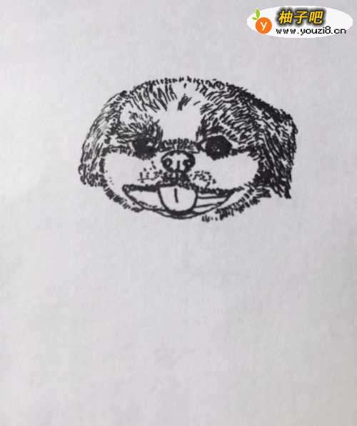 首先在白纸上用笔以点的笔触画出狗狗的头部,画出狗狗鼻子、眼睛、嘴巴、舌头。用笔画出狗狗鼻子下方两边的胡须。