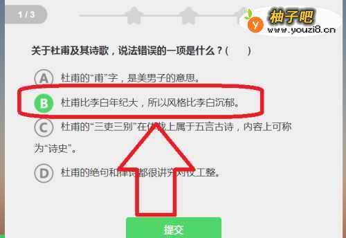 你需要在第一题选B,原因是杜甫生于公元712年,李白生于701年,比李白小11岁,杜甫比李白沉郁是因为写了很多反映战争的诗歌,跟年龄没有直接关系