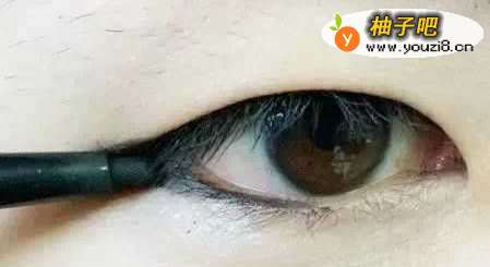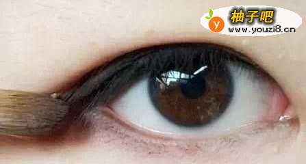 2先用眼线笔填实睫毛根部和内眼睑,眼尾稍许上扬。再用小刷子刷匀。