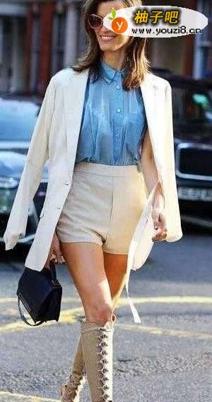 2然后,牛仔短裤可以搭配女士小西装。这种外套在夏天的室外穿可能会有点热,但是特别适合坐在空调办公室的姑娘们穿。西装的颜色最好选择纯色的,比如灰色,白色,粉红色等。