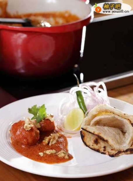 1、 将鸡肉泥、辣椒粉、孜然粉、印度咖喱粉以及盐均匀混合,再用一个汤匙将它分为几等份,每一份分别揉成球状