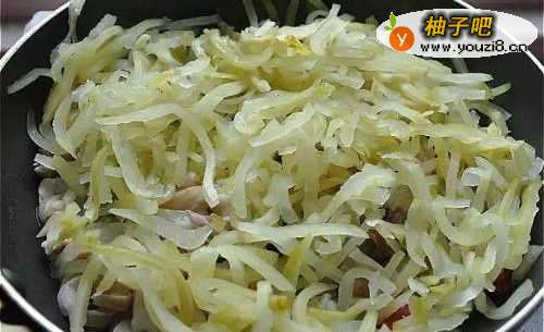 4接着放入榨菜丝热炒搅拌。