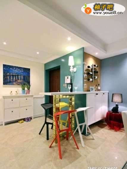 吧台设计在客厅旁边,第一是充分考虑两者相符合的气场与氛围,二是吧台的大小恰能间隔空间,使得空间富有层次感而不会显得压迫。少许的镜面运用既能体现吧台的魅力,又使得整体在充满大量色彩的前提下不显得过于刺激,既成就了吧台的完美,又保持了空间的协调。
