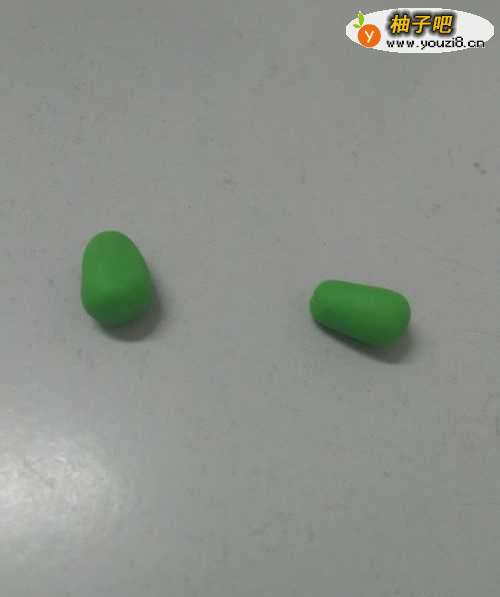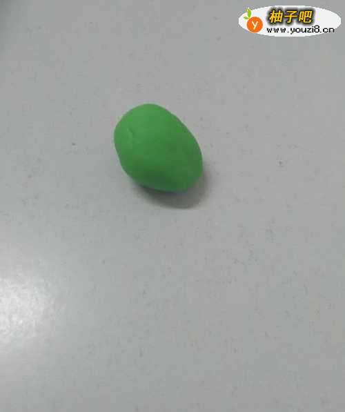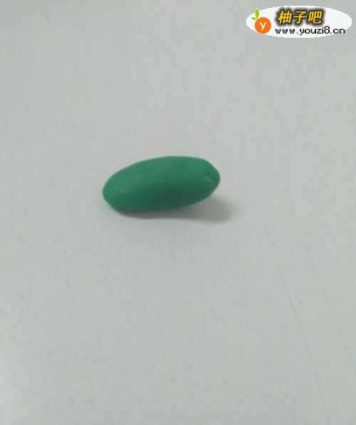 2用浅绿色捏一个玉米粒的形状,当作恐龙的头,尖部当作恐龙的嘴。
