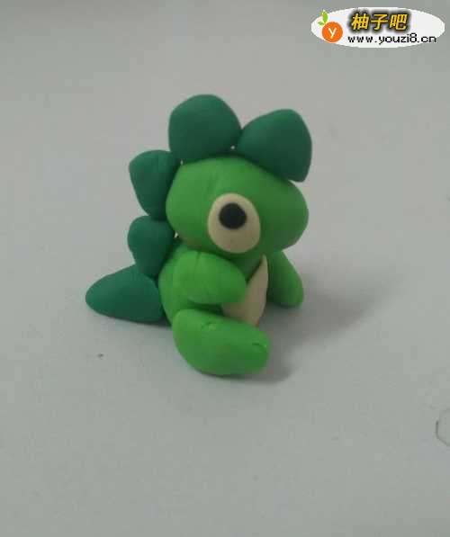 10再用浅绿色搓两个粗一些的圆条,粘在身体下方两侧,当作两个下肢,可爱的小恐龙就做完了。