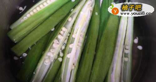 3锅热水加入少许盐,煮开后放入秋葵汆烫十秒捞出。