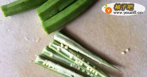 2秋葵清洗干净后切去蒂头,一分为二,二分为四。