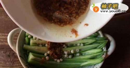 4把汆烫好的秋葵放置盘中,倒入蒜蓉生抽酱淋在表面即可。