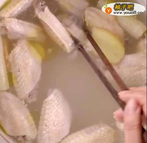 砂锅放水,加葱姜适量,放入鸡翅400g,小伙炖30分钟,鸡翅捞出备用。