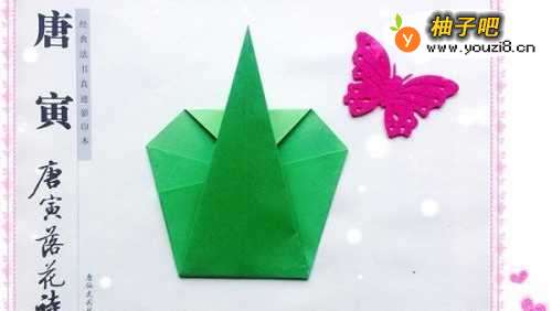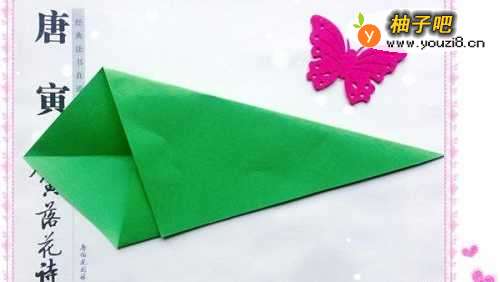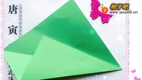 5把对角线另一边没有折的那个角往内折,尖角往上折。尖角是苹果的蒂,所以不要太长也不要太短,目测差不多就行。