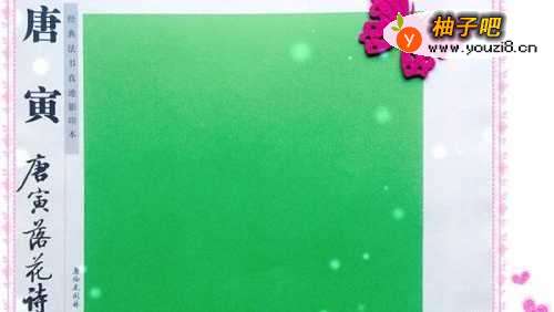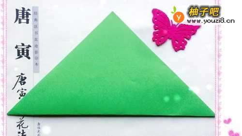 准备一张正方形彩色卡纸。因为苹果的颜色种类有很多,我今天折的折的是青苹果所以就选择绿色的卡纸了。