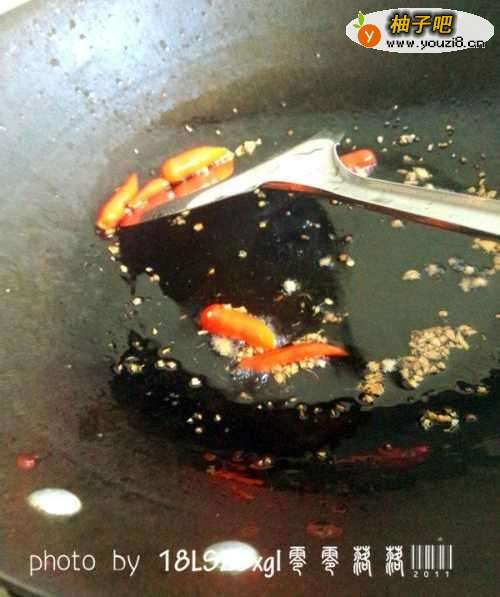 4热锅里倒入适量油,把姜蒜末放入锅里,小火炒香;之后再放入小米辣炒出香味;