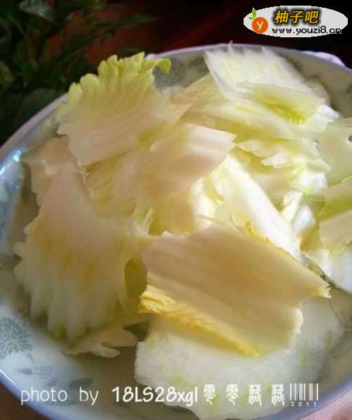 白菜邦洗净,拭干水分,像片鱼片那样,用菜刀将白菜邦片成薄片;