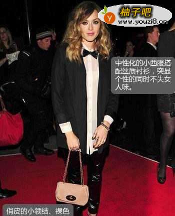 小西服搭配皮裤,这本来十分有酷感的搭配,在加上小领结和裸色系手提包的点缀后,使全黑系的搭配也变得充满跳脱味道和潮流感了。