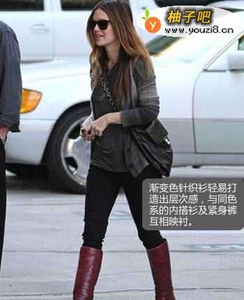 2011年春季将非常流行的时髦渐变色针织衫,搭配上枣红色长靴,不仅十分温暖,枣红色更是让你不会被淹没于人群中。