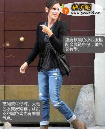 规整的黑色西服被宽松的黑灰色T恤和破洞款式牛仔裤所打破,让你整个人变得轻松而富有潮流感。