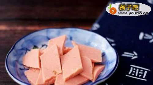 3火腿切成方形小块,放在小碟子中