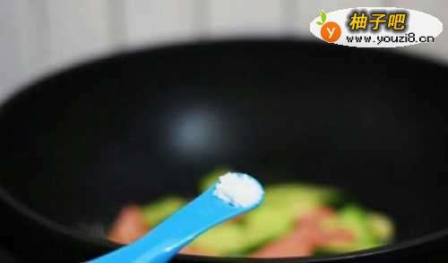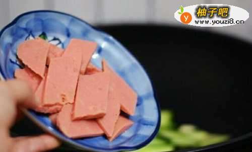 8接着放入火腿肠,炒熟