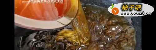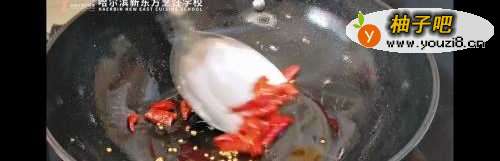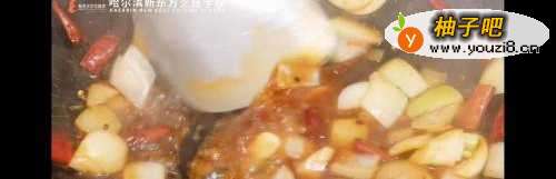 8锅中加油炒川椒,倒入切好的配料,辣椒酱,酱油,料酒,稍多米醋,鱼露,糖,鸡精,少量盐,适量水