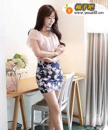 粉色雪纺衫大圆领设计,精美的荷叶袖展现精致柔美,十分小女人,搭配藏蓝色印花包臀裙,尽显曼妙曲线。