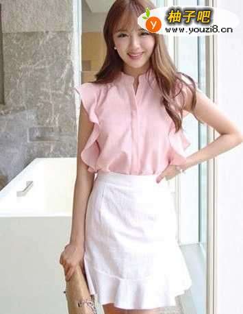 粉色衬衫加入荷叶花边设计以后,显得愈发精致、飘逸了,恰到好处地挡住了肩部位置,不少女孩的肩膀圆润多肉,这种款式穿起来不就正好么?