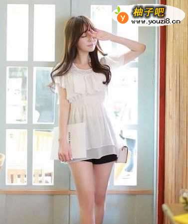 白色雪纺衫加入不少精致的细节设计,精美的蕾丝点缀,飘逸的荷叶花边装饰,打造更加轻盈的效果,搭配黑色短裤,上衣传出了超短裙的效果,格外诱人。