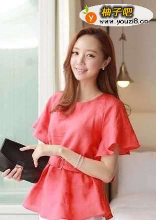 红色上衣鲜艳靓丽,细节设计尽显时尚感,精美的荷叶袖设计,藏肉显瘦,腰带款式,下摆设计成裙摆效果,真是气质尽显,女人味十足,配白色短裤非常清新。