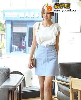 白色雪纺衫采用精美的荷叶花边设计,从肩部蔓延到腰间,轻盈而飘逸,立体花边完美隐藏多余的肉肉,配浅蓝色包臀裙清新怡人,曲线也显得格外柔美。