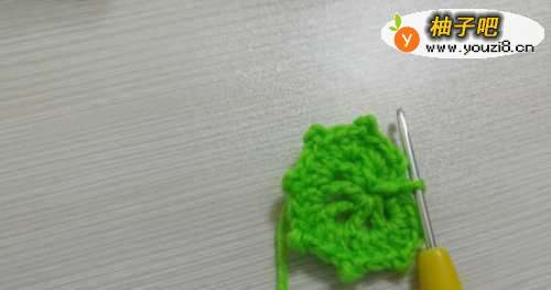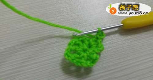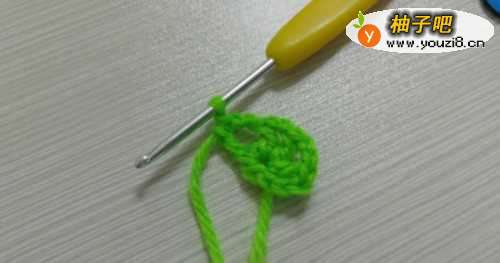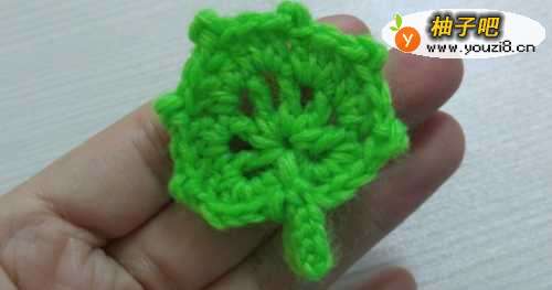 7然后就是钩织叶柄了,在上一圈拉的2辫子针处进针,拉出5个辫子针,然后返回在倒数第2针上做引拔针连接,然后再连续的做引拔针连接,这样就钩织好一片树叶了。