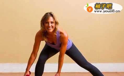 这项运动能改善肌肉一侧的骨盆以及大腿内侧的肌肉。手持哑铃,先将右脚带一个大步,身体同时向右前方弯曲。确保右膝盖弯曲的直线不超过脚趾,保持左腿拉直的姿势。再将右脚推回,回到最初的姿势,换左脚。