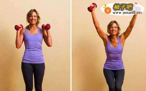 主要能锻炼大腿内侧的赘肉和运动腿筋,还能减少双臂的赘肉。两脚并拢,将哑铃提高到肩高,两肘弯曲,一同在耳侧举起,膝盖同时向地上弯曲,屁股向后。两条腿始终并拢。