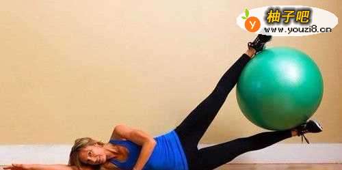 比较的具有挑战的基本练习,要努力保持球的位置。能消除大腿和大腿内侧的赘肉。侧躺在地板上,将一只手臂伸展使头依靠在手臂上,另一只手交叉撑于地板上,两脚腕夹紧一个练习球。