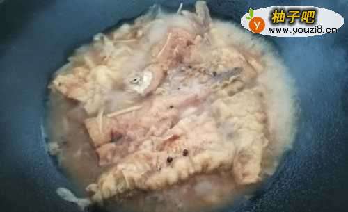 4加入适量的清水,煮开锅后,加入备好的炸鱼块,盖盖焖煮5分钟左右。