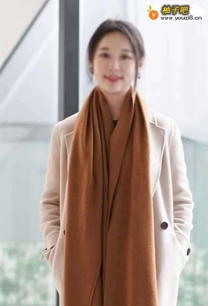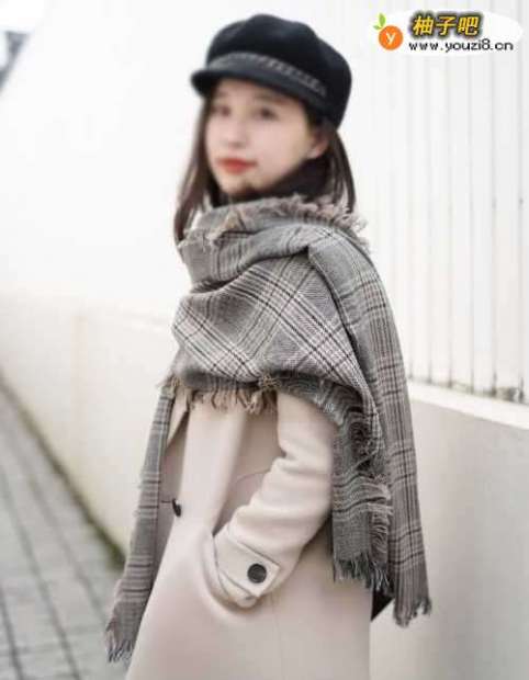 随意披在衣襟前虽然不怎么保暖,但是潇洒又随意的效果看上去还是很好看的。不过围巾的长度一定要在膝盖以上,太长不仅让你显矮,行动间还会显得拖沓。