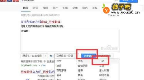 5然后点击“目标语言”,选择“日语”,接着点击“百度翻译”,如图