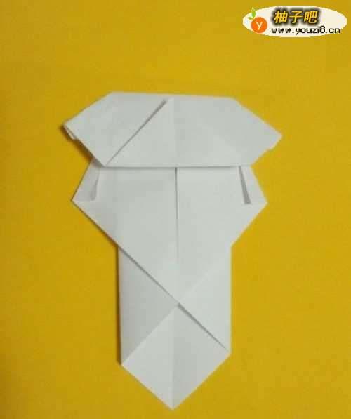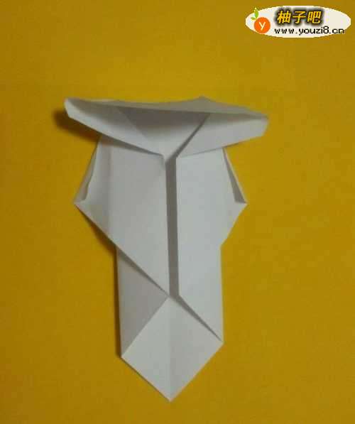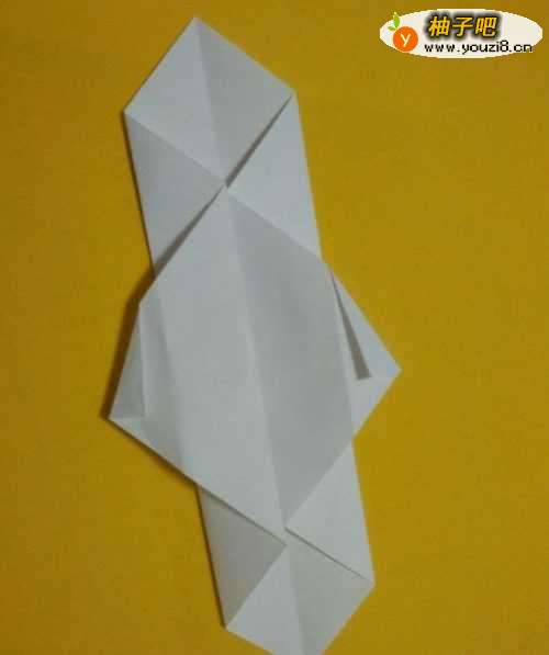 8将下半部分向上折,折好后再向下折个三角。观察图中的蓝色虚线,分别向里侧折。