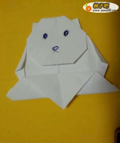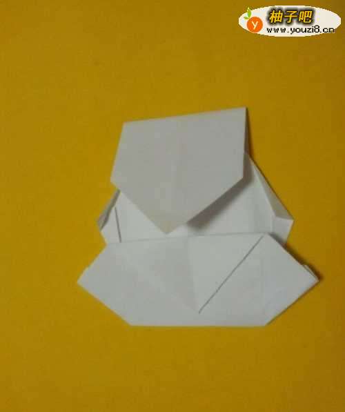 9折好后,将小熊的两个耳朵折出来,分别向外折,再向内折。如图所示。